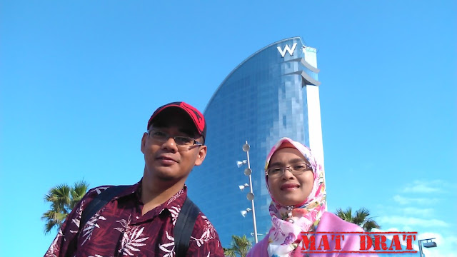 Hotel penginapan kami, W Hotel Barcelona ni terletak di hujung pantai Barceloneta. Kalau google "Barceloneta Beach", banyak gambar-gambar pengunjung berjemur di pantai ni, terutama pada musim panas.